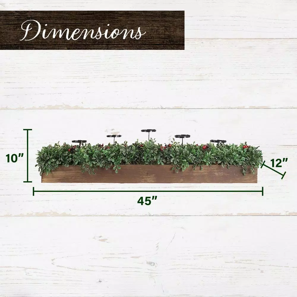 - Designer finishes: 5 pillar plates in a classic wood box overflowing with festive faux boxwood and red berries will add elegance and warmth to your home, recommended for pillar candles up to 3 in. tall (not included)