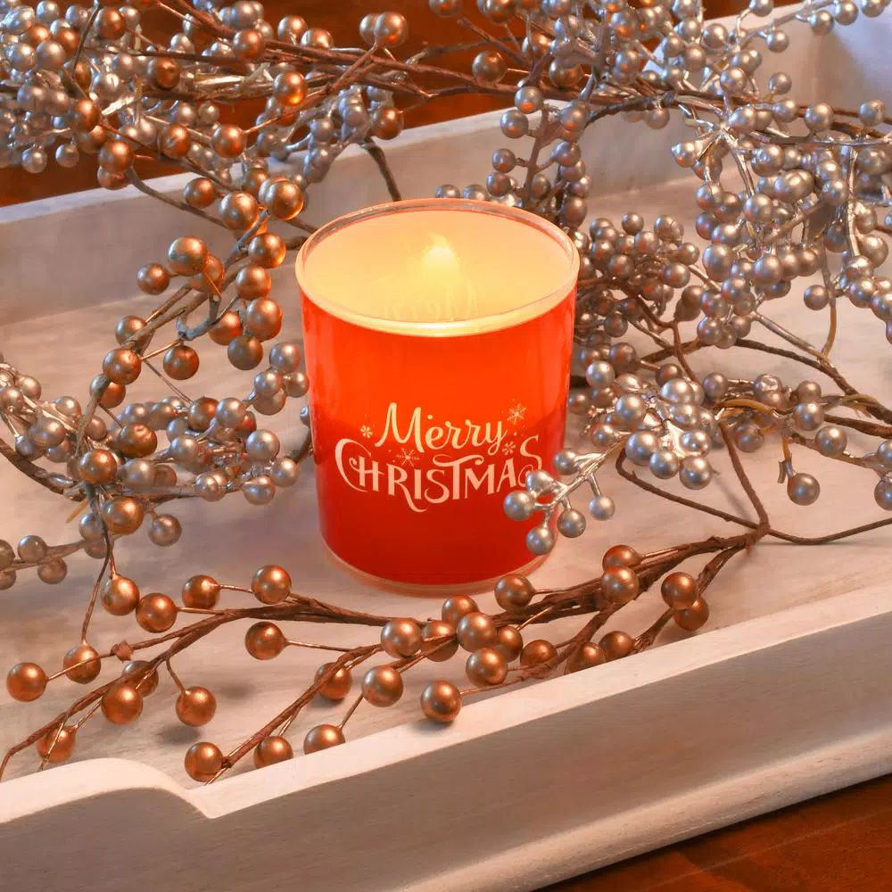 These lovely battery operated LED candles with Merry Christmas printed on glass are perfect for your holiday decor. The red glass includes genuine poured wax and an enclosed glowing LED light. The lights have a convenient 6-hour or 8-hour timer. The natural glow adds ambient lighting to your decor. Requires 2 AA batteries.