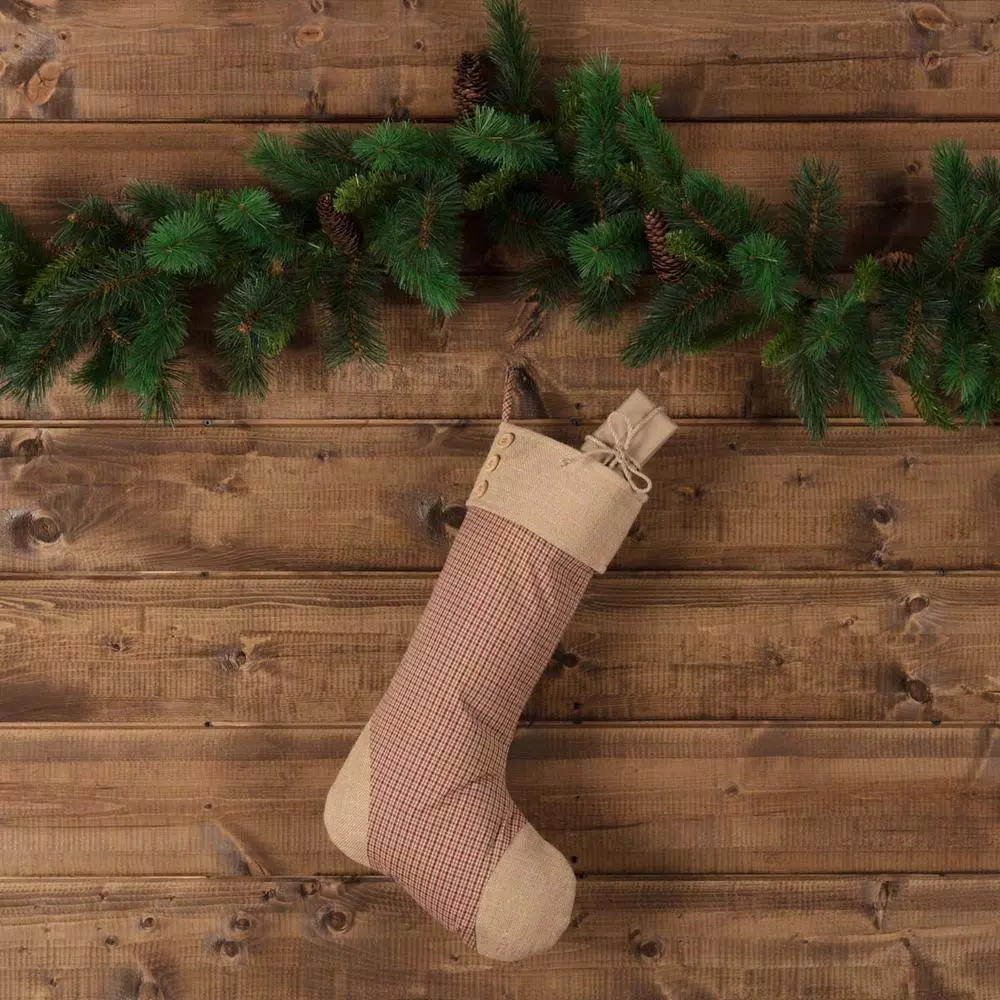 Natural jute is paired with red, black, and tan plaid soft cotton to give the Clement Plaid Stocking a Christmas look that will appeal to the everyday working citizen. Generously sized for gifts given in love. Lined with flannel and taffeta.