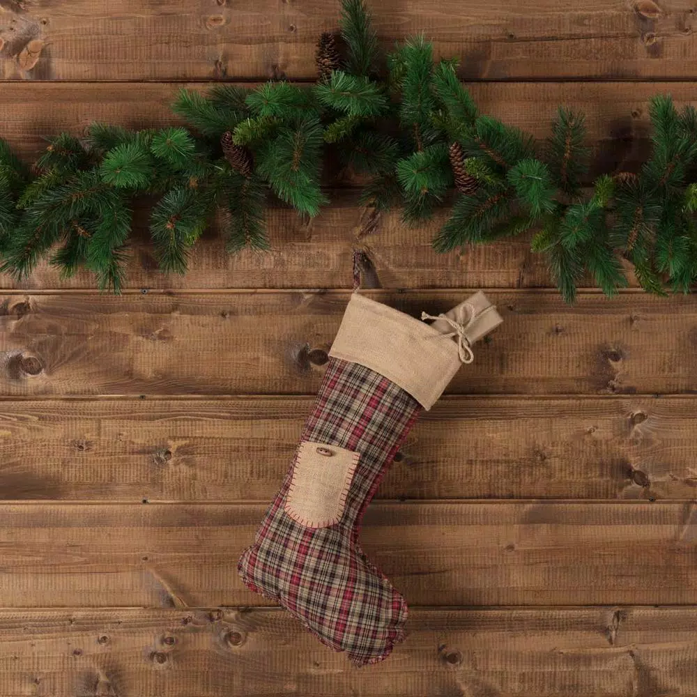 Natural jute is paired with red, black, and tan plaid soft cotton to give the Clement Plaid Stocking a Christmas look that will appeal to the everyday working citizen. Generously sized for gifts given in love. Lined with flannel and taffeta.