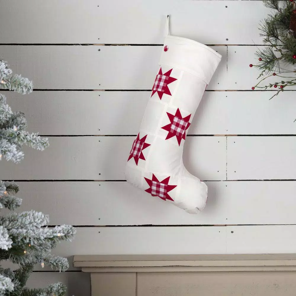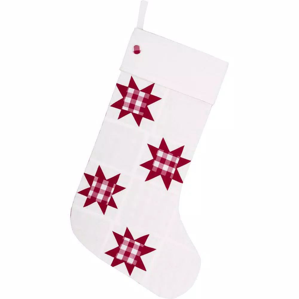 Countrify your Christmas this year with the Emmie Check Stocking. A bright white is paired with country checks. A matching button is added to the cuff and helps tie the look together. This perfect mantel decor includes a hanging loop. 100% cotton shell with flannel and taffeta lining.